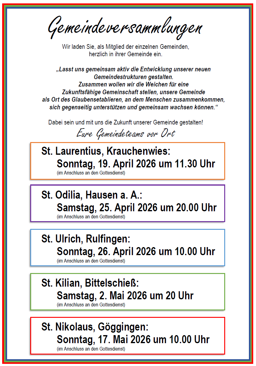 Ein herzliches Dankeschön allen Engagierten für ihre Bereitschaft zum Mitwirken und dem Pfarreirat einen guten Start, viel Freude, Erfolg und Gottes Segen für sein Wirken in der neuen Pfarrei!